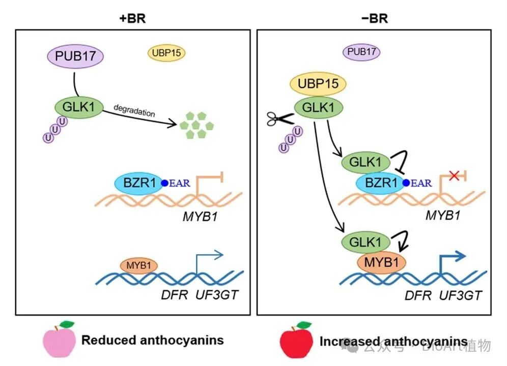 研究发现,BR信号核心调节因子MdBZR1通过其EAR基序,直接抑制花青素正调控因子MdMYB1的转录,从而负向调控果实着色。而MdGLK1则通过双重机制促进花青素合成:一方面,它通过与MdBZR1蛋白互作,解除后者对MdMYB1的转录抑制;另一方面,MdGLK1能直接与MdMYB1形成转录激活复合体,协同增强下游花青素结构基因的表达。在翻译后修饰层面,MdGLK1的蛋白稳定性受到E3泛素连接酶MdPUB17与去泛素化酶MdUBP15的拮抗调控。当BR信号存在时,其激活MdPUB17介导的MdGLK1泛素化降解,从而抑制花青素合成;而在BR缺乏条件下,MdUBP15则通过拮抗MdPUB17的泛素化作用,维持MdGLK1蛋白的稳定性,进而促进花青素积累。