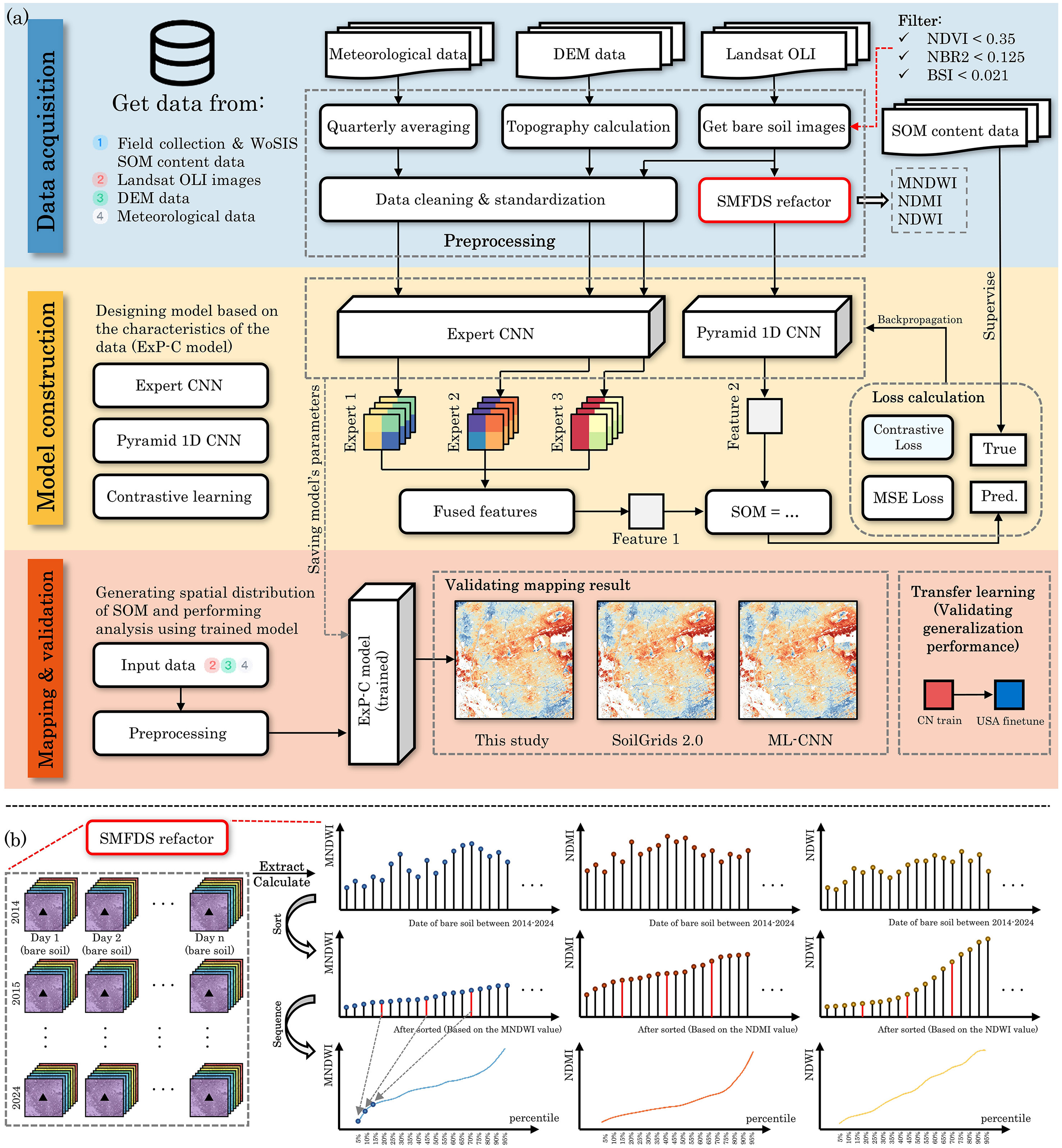 针对上述局限性,中国科学院东北地理与农业生态研究所农业遥感学科组以中美两大典型黑土区(中国东北和美国密西西比河流域)的耕地为研究对象,创新性地提出了一种融合土壤水分动态反馈序列(SMDFS)的新型时空深度学习框架(ExP-C)。研究团队收集了2014-2024年间的2616个表层(0-20厘米)土壤实测样本,并深度融合了Landsat-8裸土合成影像、SRTM地形变量以及ERA5气象等多源数据。研究通过对多时相水分相关光谱指数(MNDWI、NDWI、NDMI)进行百分位重构生成了SMDFS,从而精准捕捉了不同SOM水平与土壤水分保持能力之间的动态反馈特征。在此基础上构建的ExP-C模型,融合了用于提取静态协变量空间上下文特征的“专家卷积网络”,以及用于挖掘多尺度SMDFS时间序列模式的“金字塔1D卷积网络”,并结合对比学习策略进一步增强了模型的特征表示能力。