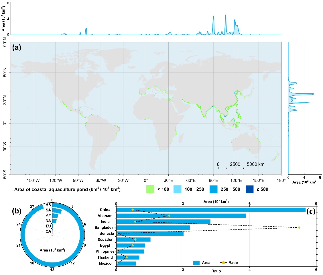 滨海养殖是全球海产品获取的重要途径之一,对于满足全球人口快速背景下的经济发展需求具有重要的支撑意义。与此同时,滨海养殖池分布的快速扩张,也导致了一系列严峻的生态和环境问题,例如生境破坏、水体富营养化、温室气体排放加剧等。然而,全球尺度上滨海养殖池的时空变化过程的定量化评估仍未实现,全球滨海养殖池的分布及其长期变化的定量信息仍较缺乏,阻碍了海岸带韧性评估与滨海生态系统的可持续管理。